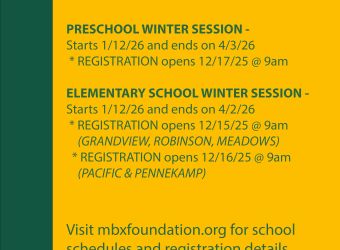 Visit mbxfoundation.org for school schedules and registration details. Ages: Pre-school and Elementary Students / View the flyer PRESCHOOL WINTER SESSION starts 1/12/26 and ends on 4/3/26. REGISTRATION opens 12/17/25. CLICK here for class list and registration details. ELEMENTARY SCHOOL WINTER SESSION starts 1/12/26 and ends on 4/2/26. …