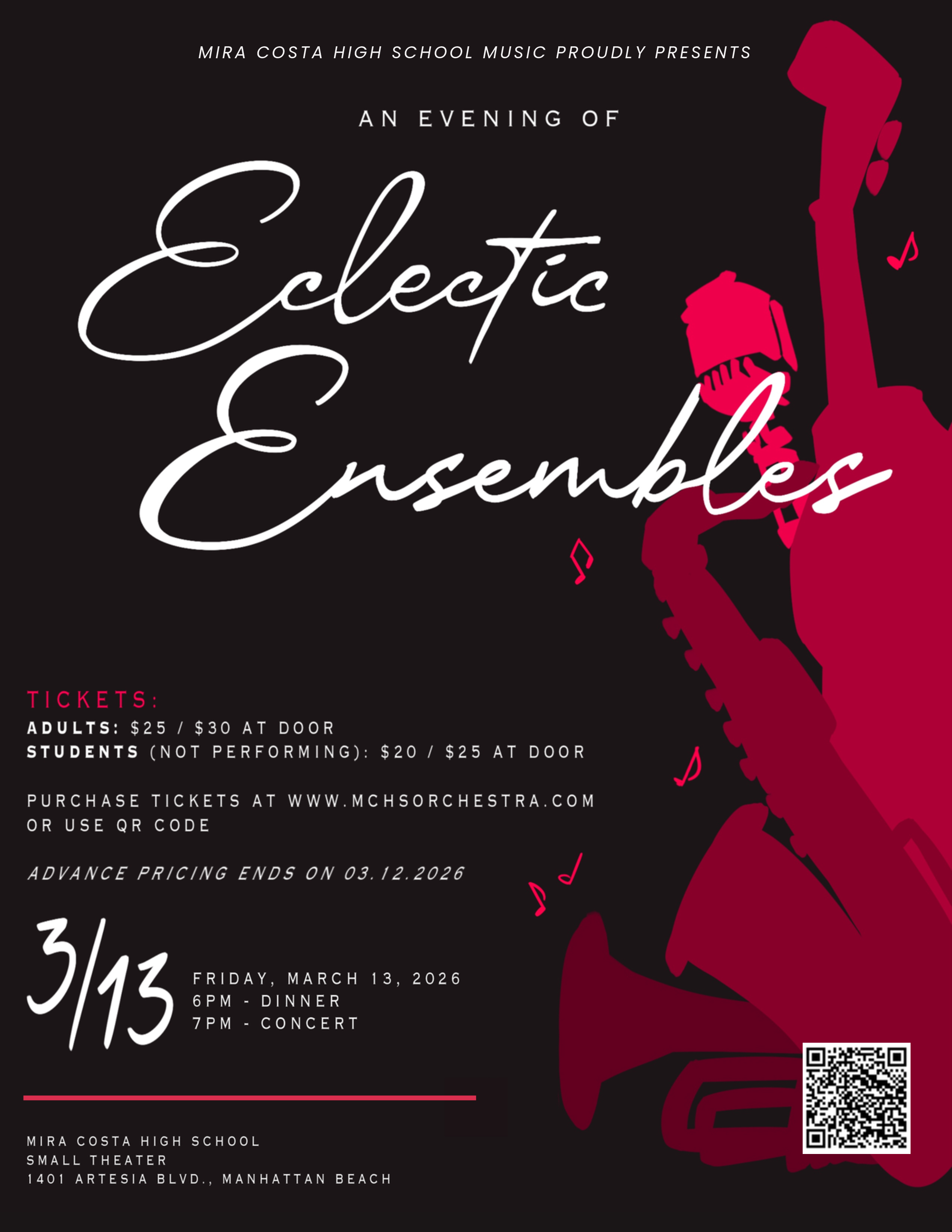 Join Band, Choir, and Orchestra for our 9th Annual Evening of Eclectic Ensembles on Friday, March 13th! Enjoy dinner at 6:00 pm in the Cafeteria, followed by a concert at 7:00 pm in the Small Theater.