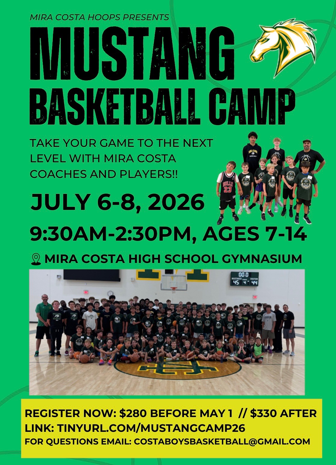 Mira Costa Boys Basketball Summer Camp with the Varsity Coaching Staff and players. Monday, July 6 through Wednesday, July 8, 9:30am to 2:30pm for boys and girls ages 7-14. Register now for the Early Bird $275 price! Price increases to $325 after May 1st.