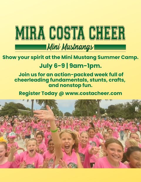 Show your spirit at the Summer Mini Mustang Camp at Mira Costa High School. Join us for an action-packed week full of cheerleading fundamentals, stunts, crafts, and nonstop fun. GO COSTA!!! Ages: 4-12 / Register here / View the flyer