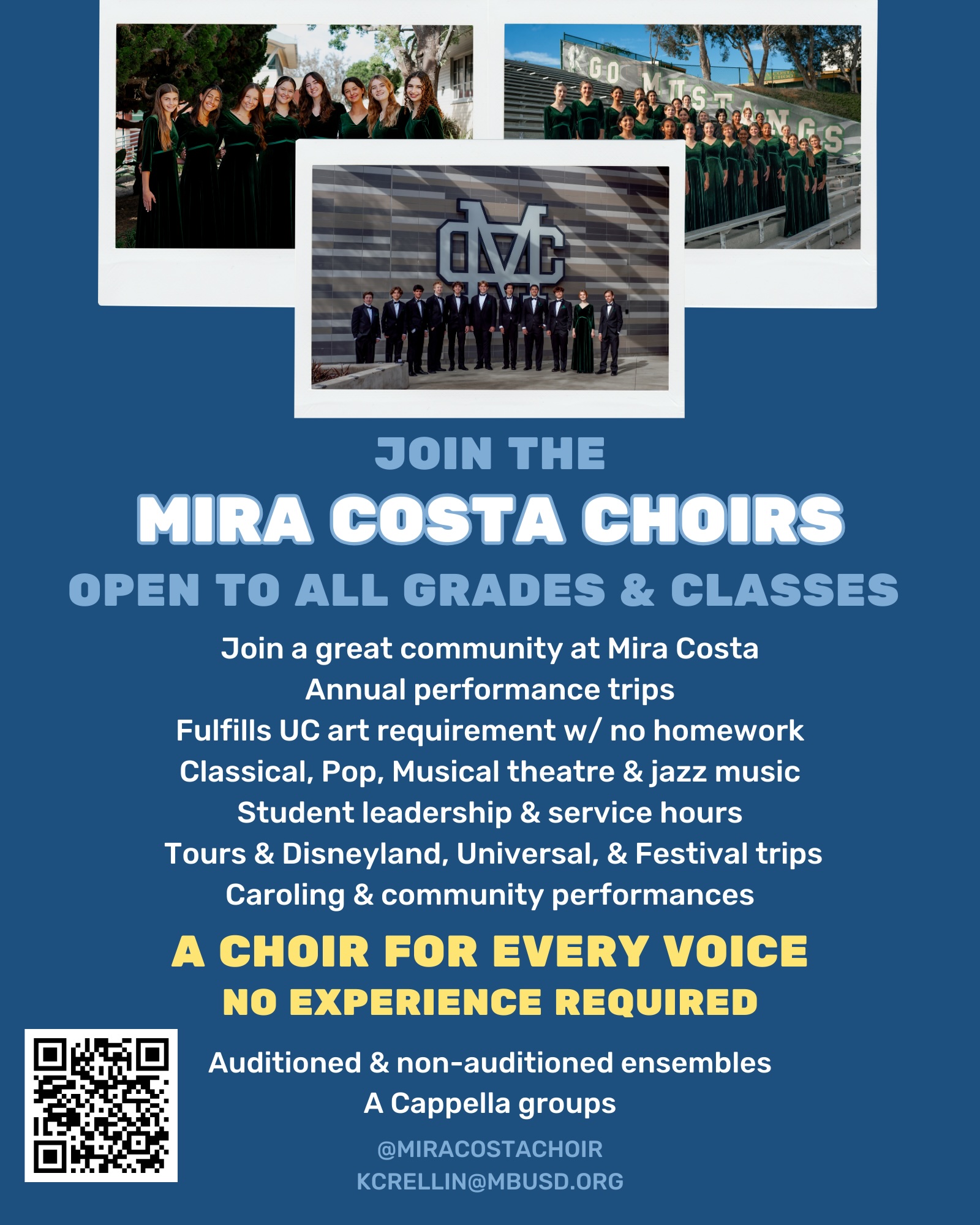 Mira Costa Choir Auditions 2026-27 Auditions for the Mira Costa Choirs are OPEN NOW! Open to all grade levels and experience levels – plus join us for our INTERNATIONAL 2027 tour! Ages: Incoming 9 to 12th / Sign up here / View the flyer