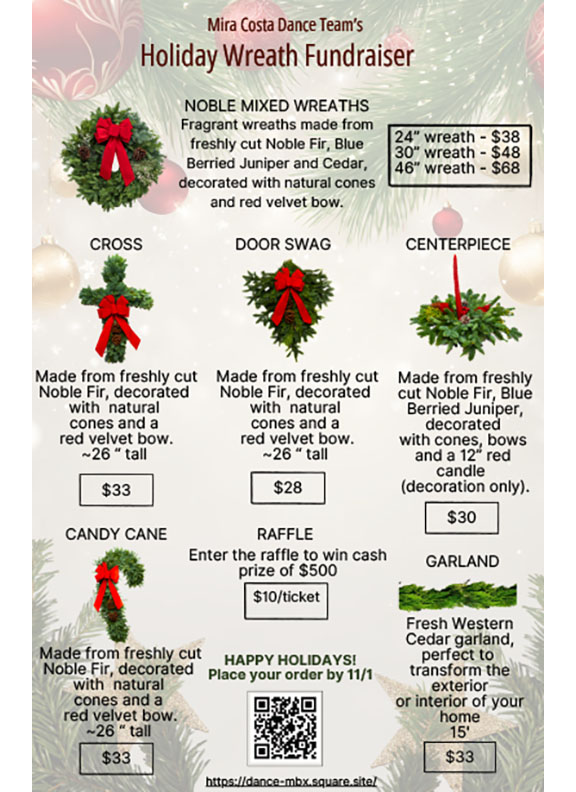 The annual Mira Costa Dance Team holiday wreath fundraiser is BACK! Purchase your fresh holiday wreaths and garland made from freshly cut Noble Fir, Blue Berried Juniper and Cedar.