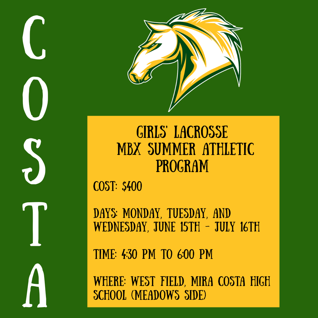 Enroll in the 2026 MBX Summer Girls’ Lacrosse Athletic Program. This summer, we are offering high-intensity training sessions to help our current and incoming Costa athletes take their skills to the next level. Ages: incoming 9-12th / Register here / view the flyer