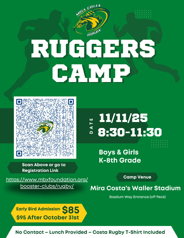 Kids (boys & girls) will have a blast at our RUGGERS NON-CONTACT DAY CAMP on Veterans Day run by Mira Costa High School Varsity Rugby Coaches and Rugby Athletes, playing games, learning skills, eating lunch and going home with an MCHS Rugby t-shirt. Elite Ruggers ages 11-14 will receive an introduction to our High School experience presented by Head Coach Duke Dulgarian.
