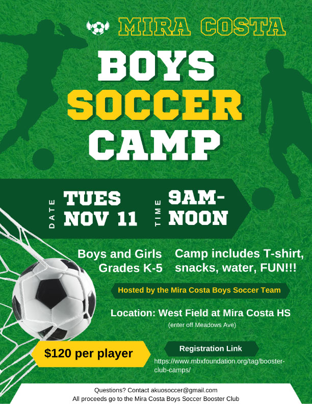 Come kick it with the Mira Costa Boys Soccer team for a fun and energetic half-day camp! Join us on Tuesday, November 11 from 9 AM to noon—open to all students in grades K-5th grade. Spend the morning enhancing your soccer skills through age-appropriate drills and scrimmages. It’s a high-energy, action-packed day and the perfect way to support our Mustang Soccer Team. Space is limited so register early!