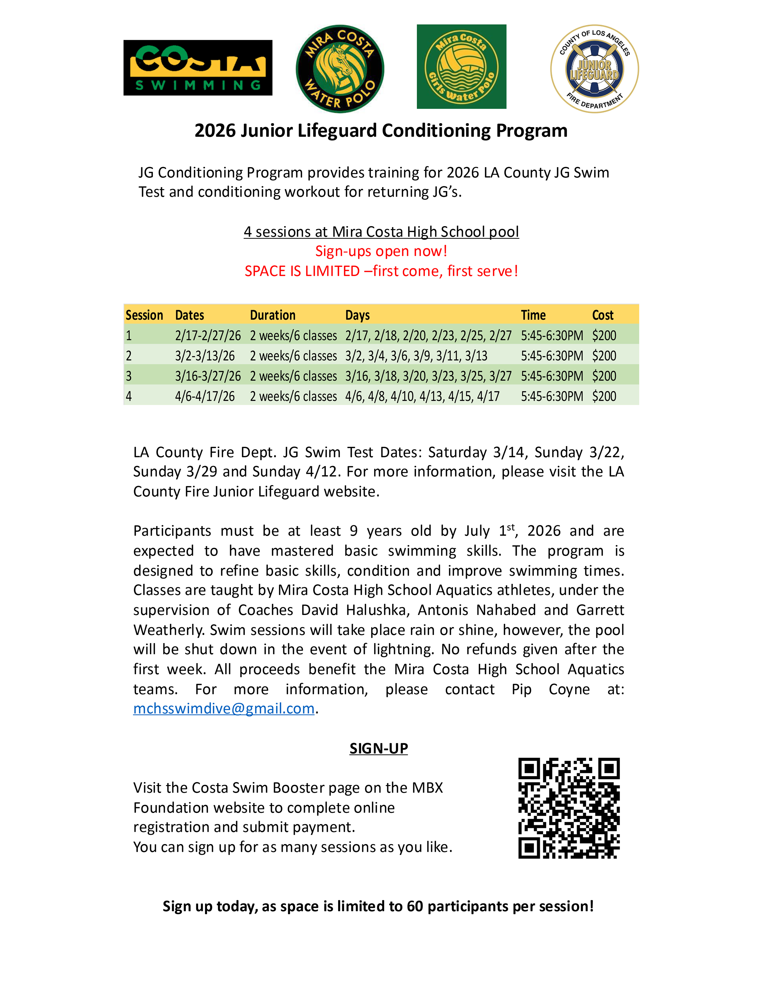Camp date(s): Session 1: 2/17-2/27/26; Session 2: 3/2-3/13/26; Session 3: 3/16-3/27/26; Session 4: 4/6-4/17/26, Mon/Weds/Fri except for first date of 2/17 because of President’s Day, 5:45pm-6:30pm. JG Prep Classes run by Mira Costa Aquatic Boosters (Swim, Girls Water Polo, Boys Water Polo), JG Prep classes are taught by Mira Costa Aquatic athletes under the guidance of our Coaches. Classes are designed for swimmers 9+ who are looking to pass the Junior Lifeguard test and returning JG’s who need to refresh their skills.