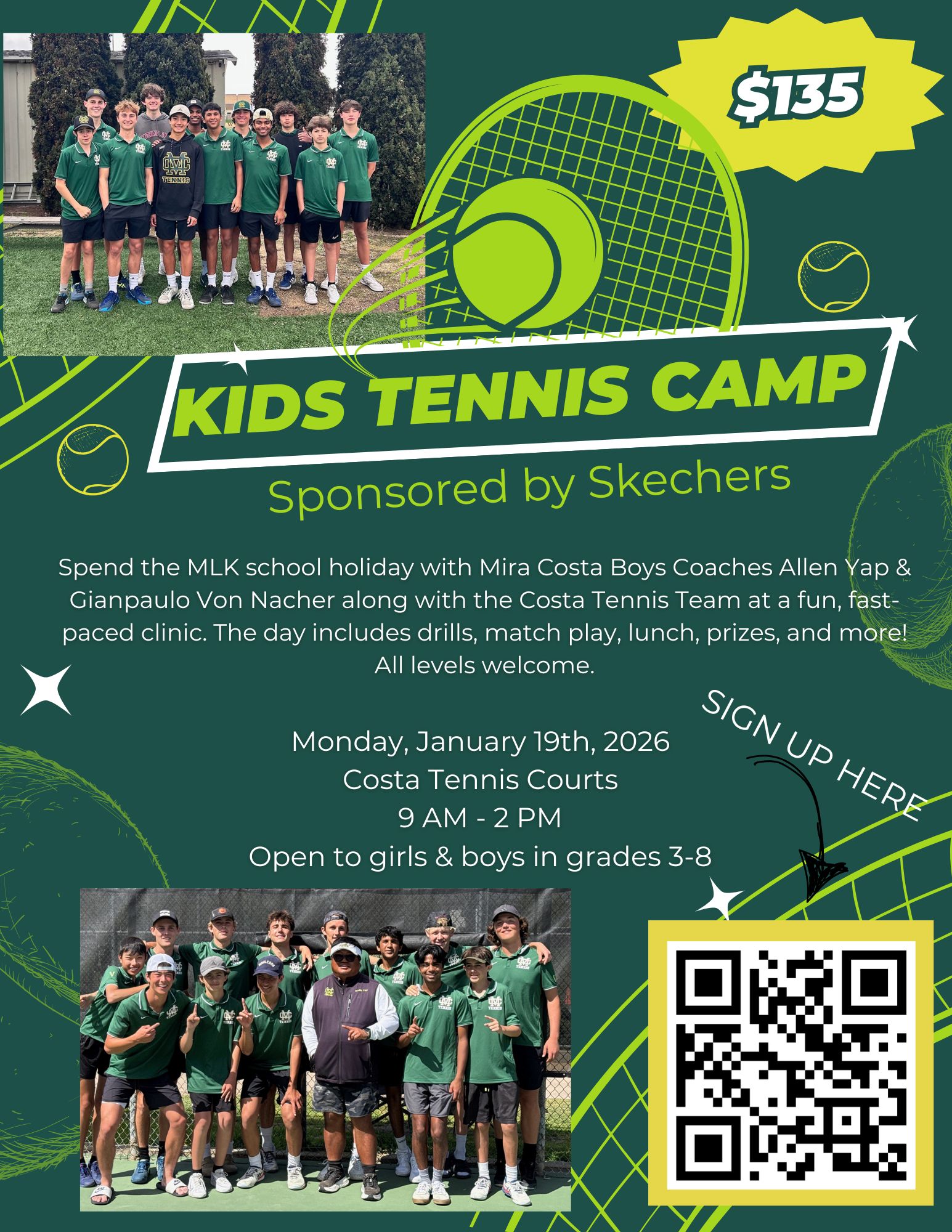 Spend the MLK school holiday with Mira Costa Boys Coaches Allen Yap & Gianpaulo Von Nacher along with the Costa Tennis Team at a fun, fast-paced clinic. The day includes drills, match play, lunch, prizes, and more! Ages: All levels welcome. Register here / View the flyer