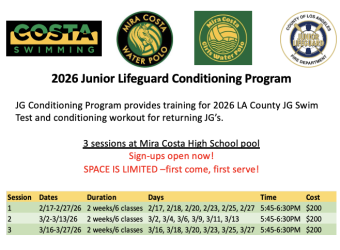 Camp date(s): Session 1: 2/17-2/27/26; Session 2: 3/2-3/13/26; Session 3: 3/16-3/27/26, Mon/Weds/Fri except for first date of 2/17 because of President’s Day, 5:45pm-6:30pm. JG Prep Classes run by Mira Costa Aquatic Boosters (Swim, Girls Water Polo, Boys Water Polo), JG Prep classes are taught by Mira Costa Aquatic athletes under… Keep reading