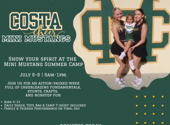 Show your spirit at the Summer Mini Mustang Camp at Mira Costa High School. Join us for an action-packed week full of cheerleading fundamentals, stunts, crafts, and nonstop fun. GO COSTA!!! Ages: 4-12 / Register here / View the flyer