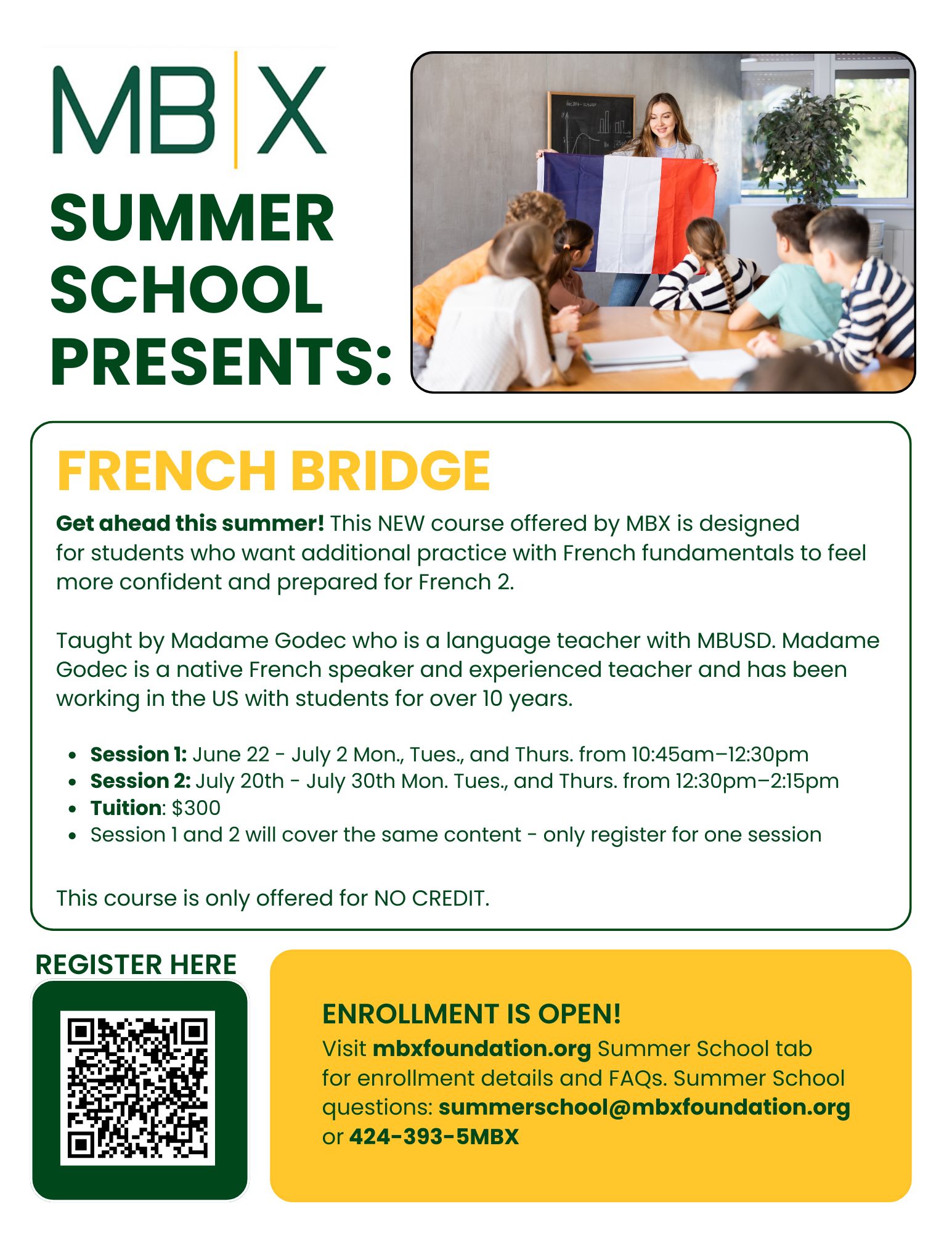 Get ahead this summer! This NEW course offered by MBX is designed for students who want additional practice with French fundamentals to feel more confident and prepared for French 2. This course is only offered for NO CREDIT. Session 1 and 2 will cover the same content – only register for one session. Ages: Middle School / Register here / View the flyer