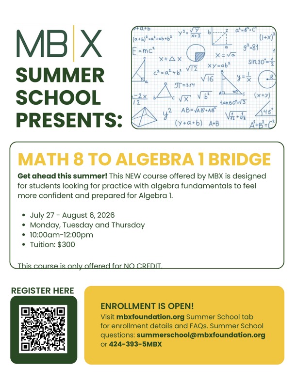 Get ahead this summer! This NEW course offered by MBX is designed for students looking for practice with algebra fundamentals to feel more confident and prepared for Algebra 1. This course is only offered for NO CREDIT.